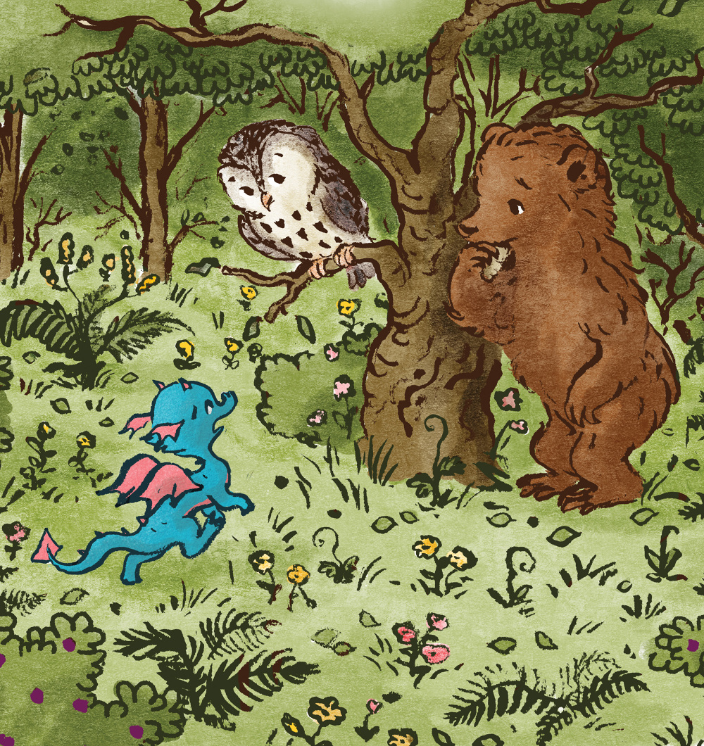 Thick lines, yellow and blue hues, anthropomorphized animals, brush pens, pencils, Ipad